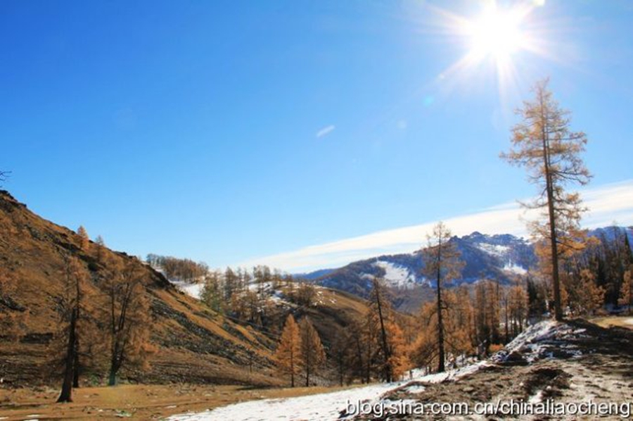 太陽當(dāng)空,陽光照射在白雪上,映襯著遠(yuǎn)處的高山,顯得格外刺目