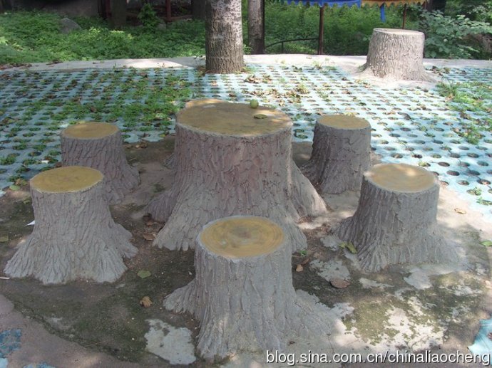 這是用樹(shù)墩制作而成的桌椅,顯得很奇異,顯得讓人有一種回歸自然的感覺(jué)