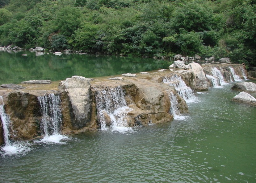 三、潭瀑峽地處云臺(tái)山北部略偏西,是主要河流子房河的一個(gè)源頭。溝長(zhǎng)2000米,南北走向。溝東面,峭壁聳翠,基巖裸體。溝西面,競(jìng)秀峰參差俏麗,峰群一字排列,峰峰直立,爭(zhēng)奇斗異。在曲曲彎彎的溝槽內(nèi),瀠洄著一條會(huì)唱歌、會(huì)跳舞的溪水。這條能歌善舞的溪水叫小龍溪。它的溪床,由一層層高低不一、色彩有別、寬窄不同、曲折有致、形態(tài)各異的自然山石臺(tái)階所組成。小龍溪?jiǎng)t像一隊(duì)美麗的歌舞明星,以層層臺(tái)階作舞臺(tái)載歌載舞,翩翩歷階而下。并在每個(gè)石階舞臺(tái)上,表演出精彩的節(jié)目,奉獻(xiàn)出妙不可言的美景?;虮滩ㄊ幯?,或?yàn)橄?,或分水涓涓?xì)流,或匯合湍湍激流,或傾瀉、或跌落成為銀光閃閃的瀑布,瀑下積水,成為彩潭。色澤悅目,清音悅耳。承蒙大自然造化的神奇,逆水而行,有如游仙,步步引人入勝,美景層出不窮,好戲連臺(tái),演奏出十二部美好的山水樂章。即:迎賓第一潭、九對(duì)情人、翡翠仙子、金潭銀瀑、丫字瀑潭、群芳競(jìng)秀、隋唐山寨、清漪仙池、水簾仙居、碧玉仙子、仙蹤劍影、龍鳳呈祥。
