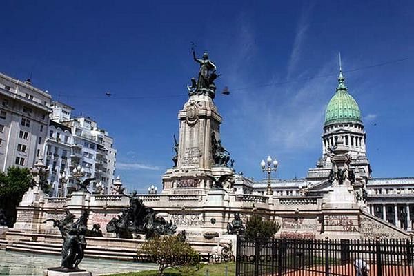 大廈前屹立著氣勢(shì)宏偉,造型別致精美的兩會(huì)紀(jì)念碑。紀(jì)念碑底座是一個(gè)寬闊的花崗巖平臺(tái),四個(gè)角上雄踞著展翅欲飛的銅塑雄鷹,紀(jì)念碑頂上站立著一尊代表共和國的婦女銅像,她右手持象征勝利的月桂枝,左手扶犁代表勞動(dòng),腳下踏著一條毒蛇,表示懲戒邪惡。版權(quán)所有山東聊城聊之旅國際旅行社有限公司,轉(zhuǎn)載必究!紀(jì)念碑的中部兩側(cè),各有一個(gè)婦女雕像,一個(gè)高舉掙斷了的鐵鏈,象征1813年大會(huì),另一手拿國旗、國徽,象征1816年議會(huì)。緊靠紀(jì)念碑底座前邊有一座音樂噴泉。花崗巖的水池周圍,有一組生動(dòng)的銅雕。一個(gè)男青年腰圍飄逸的布裙,象征著奔流的拉普拉塔河水,他身邊兩位捧罐倒水的婦女則代表拉普拉塔河的兩個(gè)支流,在他們前面有四匹駿馬好似從水中騰躍而起,馬口也是噴泉的出水口,此外還有造型逼真的蜥蜴、水蛇等拉普拉塔河流域的動(dòng)物。音樂聲起,水柱騰空,隨著節(jié)拍搖弋起舞。夜晚配以變幻的燈光,場(chǎng)面更加迷人。