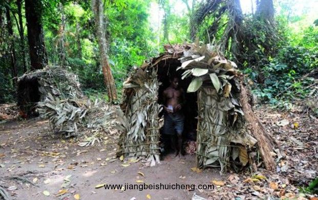 一刻鐘后,我們來到了一塊林中空地。只見芭蕉和芒果樹圍繞的空地上蓋有三五茅舍,幾個手持梭鏢的卑格米人已經(jīng)在路口相迎。他們有的赤膊,有的穿T恤;他們果然長得很矮,最高的大概也只有1米40左右,大部分都是1米30左右。他們挺胸凸肚,走起路來好像都有點(diǎn)外八字,連肚臍眼都特別向外突出。那些茅舍都是用樹枝、藤蔓、樹皮和樹葉糊上泥土搭成的,非常簡易,好像經(jīng)不起稍微大一點(diǎn)的風(fēng)吹。茅舍里面空空如也,幾乎沒有什么可以稱為家具的東西。幾個婦女正坐在一個茅舍涼亭里,旁邊是一些鍋碗類的炊具,好像是剛吃了飯?jiān)诹奶?。幾個孩子在旁邊跑來跑去,從外表看,完全是一幅普通的民間風(fēng)俗圖。