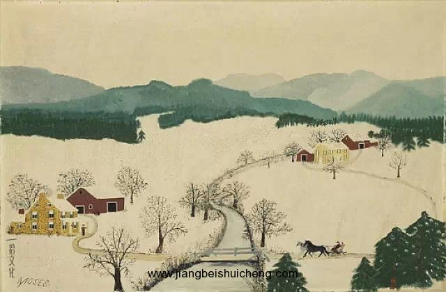 有人問,你為什么在年老時選擇了繪畫,是認為自己在畫畫方面有成功的可能嗎?我的生活圈從未離開過農(nóng)場,曾是個從未見過大世面的貧窮農(nóng)夫的女兒、農(nóng)場工人的妻子。在繪畫前,我以刺繡為主業(yè),后因關節(jié)炎不得不放棄刺繡,拿起畫筆開始繪畫。假如我不繪畫的話,興許我會養(yǎng)雞。