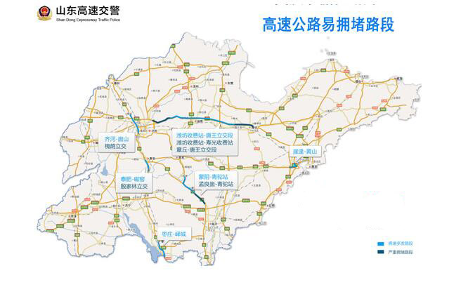 此外,山東省內(nèi)高速公路可能出現(xiàn)的堵點(diǎn)有: G20青銀高速濰坊收費(fèi)站-唐王立交段K150-K330,重點(diǎn)擁堵多發(fā)路段為濰坊收費(fèi)站-壽光收費(fèi)站K150-K180,章丘-唐王立交段K300-K330;G2京滬高速蒙陰K551-青駝?wù)綤530-K590,重點(diǎn)擁堵多發(fā)路段為孟良崮(K578)-青駝?wù)綤560-K590;G22青蘭高速崖逢-黃山K60-K75;G3京臺(tái)高速齊河-崮山K380-K410,泰肥-磁窯K470-K500, 棗莊-嶧城K620-K650;G2001濟(jì)南繞城高速殷家林立交、槐蔭立交附近路段。