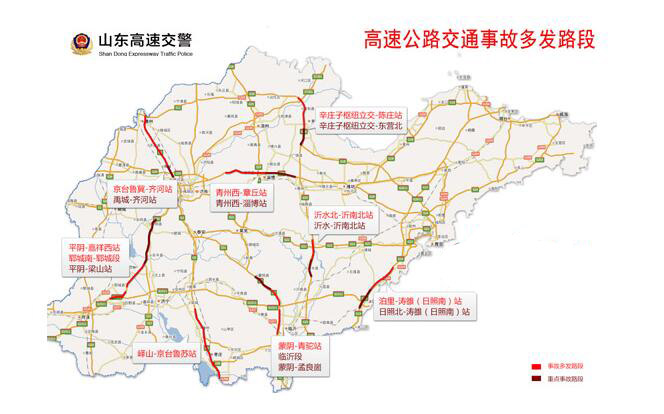 通過對2012、2013、2014、2015年事故多發(fā)道路統(tǒng)計(jì)分析,預(yù)測2016年國慶節(jié)事故主要集中在G20青銀高速青州西-章丘站K210-K300,重點(diǎn)事故多發(fā)路段為青州西-淄博站K210-K240;G3京臺(tái)高速京臺(tái)魯冀-齊河站K300-K390和嶧山-京臺(tái)魯蘇站K570-K660,重點(diǎn)事故多發(fā)路段為禹城-齊河站K360-K390;G18榮烏高速辛莊子樞紐立交-陳莊站K450-K510,重點(diǎn)事故多發(fā)路段為辛莊子樞紐立交-東營北K450-K480。G15沈海高速泊里-濤雒(日照南)站K680-K740,重點(diǎn)事故多發(fā)路段為日照北-濤雒(日照南)站K710-K740。G35濟(jì)廣高速平陰-嘉祥西站K100-K190,鄆城南-鄆城段K212-K232,重點(diǎn)事故多發(fā)路段為平陰-梁山站K100-K160;G2京滬高速蒙陰-青駝?wù)綤540-K600,臨沂段K610-K638,重點(diǎn)事故多發(fā)路段為蒙陰-孟良崮K540-K570;G25長深高速沂水北(K1507 )—沂南北站K1490-K1550,重點(diǎn)事故多發(fā)路段為沂水-沂南北站K1520-K1550。