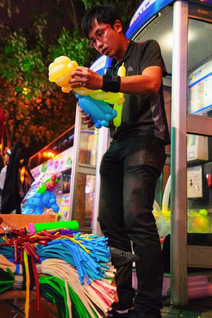 主角登場。這位小哥憑借靈巧的雙手,無與倫比的迅捷,以及來圖即興創(chuàng)作的本領(lǐng)俘獲了無數(shù)膝蓋,當然還有花花綠綠的港幣。這是真本事,比旁邊那個不停做重復(fù)扭動狀靠photo me來賺錢的歐吉桑有技術(shù)含量的多。在這“路邊攤”旁,我終于體會了一把好整以暇等待的愜意,而不用和老板一起提心吊膽、張皇四望,時刻準備著為一句“城管來啦”而百米沖刺。