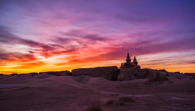 午后趕到【黑城遺址】(游覽時間約30分鐘)。(國慶時人多車堵,建議大家備一些干糧帶上)西夏古城黑水城位于內(nèi)蒙古西部額濟(jì)納旗巴丹吉林沙漠西北部,在西夏和元代時最為鼎盛,是古代絲綢之路上的重要城市。20世紀(jì)初,俄國軍人科茲洛夫和英國人斯坦因才在黑水城發(fā)現(xiàn)了大量的西夏文獻(xiàn),并運送出境由于沙化嚴(yán)重,黑水城四周的城墻已有半數(shù)為流沙掩埋。遺址西北角上聳立的佛塔,基座也被風(fēng)沙剝蝕得裂痕斑斑,城中殘垣斷壁隨處可見。黑水城經(jīng)歷了歲月的滄桑,帶著風(fēng)沙的刻痕,在茫茫沙漠和戈壁依然聳立;