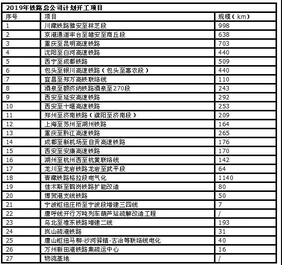 表一:2019年鐵路總公司計(jì)劃開工項(xiàng)目
