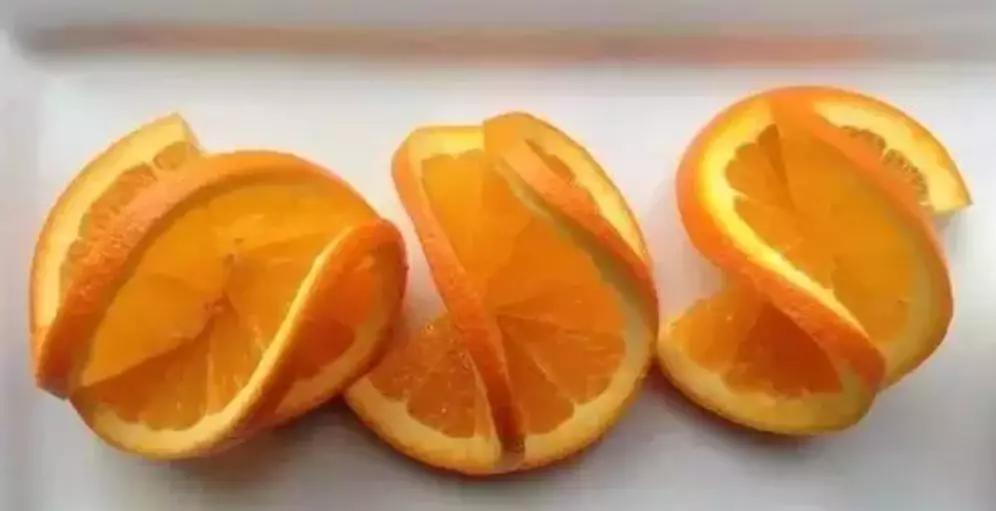 1.先把橙子頂部去掉,然后先切3mm厚度的橙片,切至2/3處收刀,