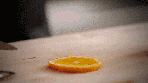 這次完全切下,保持兩片橙片連接在一起。
