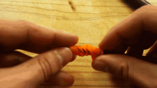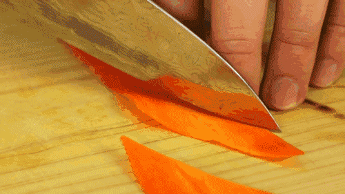 2.再在胡蘿卜片中間,切出平行切口,注意保持兩端相連。