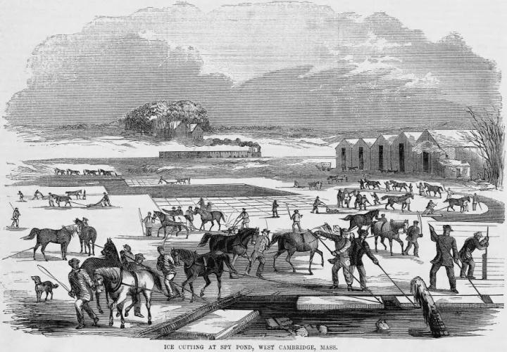 Spy Pond, Arlington 開(kāi)采河冰的場(chǎng)景。都鐸的手下發(fā)明了一種用馬拉著的鐵質(zhì)刀具切割河冰。