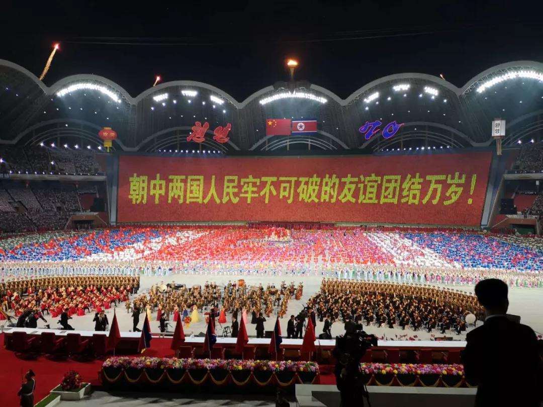 當晚,能容納10萬余人的“五一”體育場座無虛席?!盁崃覛g迎習近平總書記同志和彭麗媛女士”、“平壤-北京”等標語格外醒目。