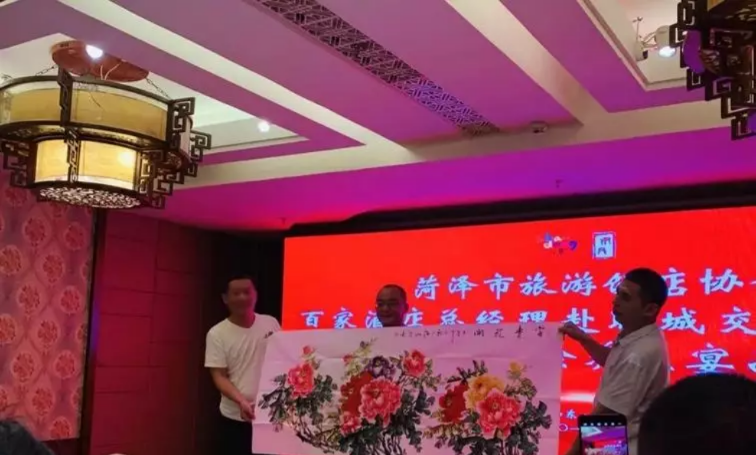 (菏澤旅游飯店協(xié)會(huì)張榮琪會(huì)長(zhǎng)代表考察團(tuán)一行向伊尹酒店贈(zèng)送牡丹圖)