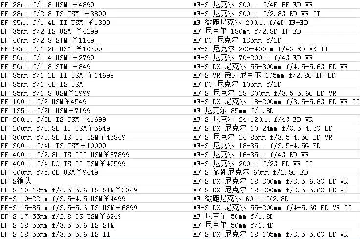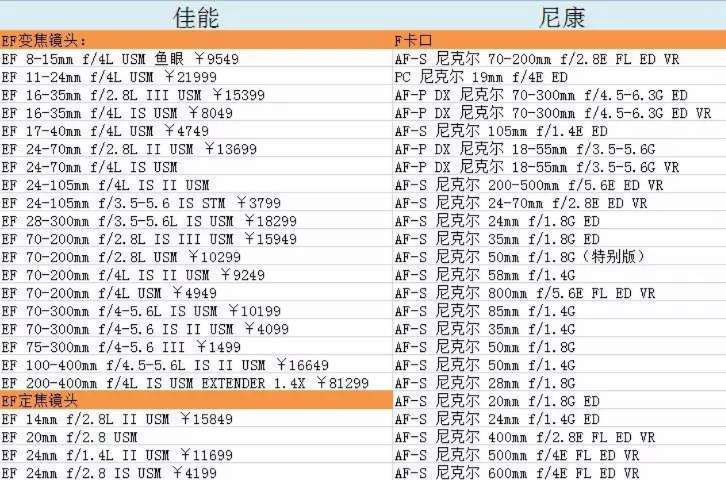下面給大家整理了佳能、尼康目前在售的單反鏡頭,由此可見,廠商為了給廣大攝影愛好者提供一個更好的攝影體驗,也是牟足了勁。