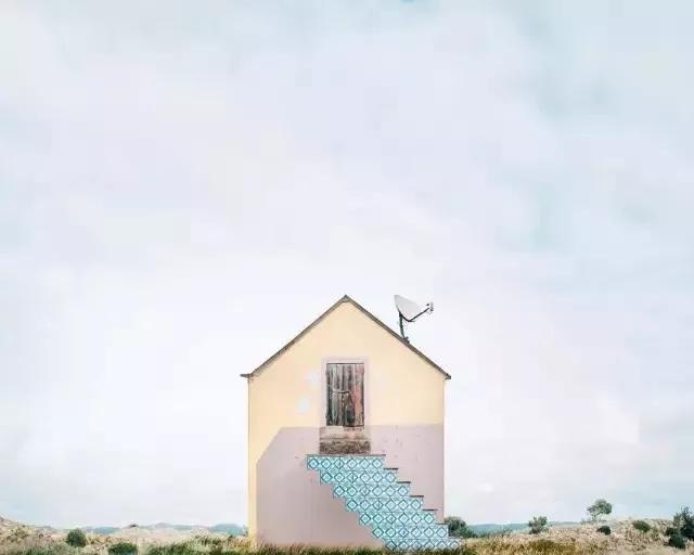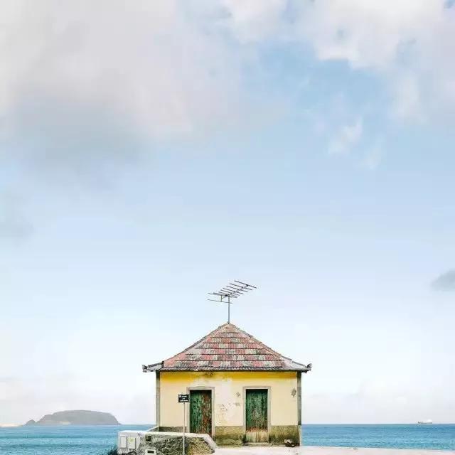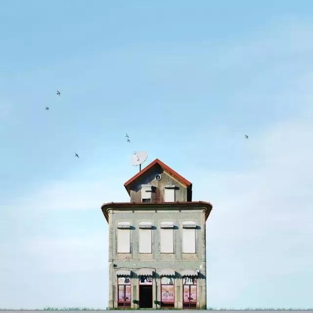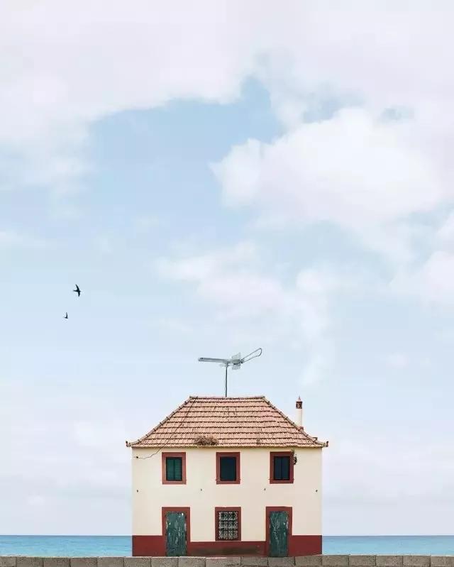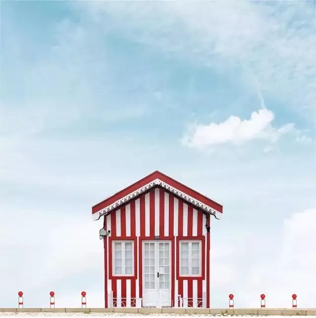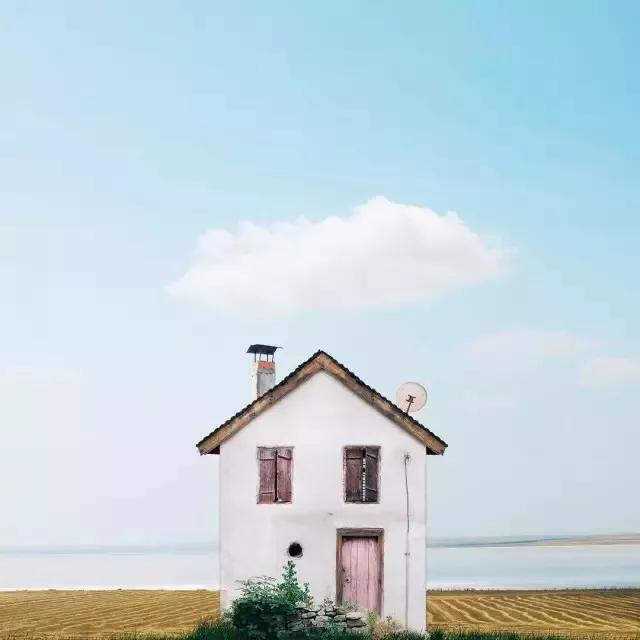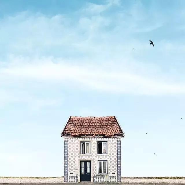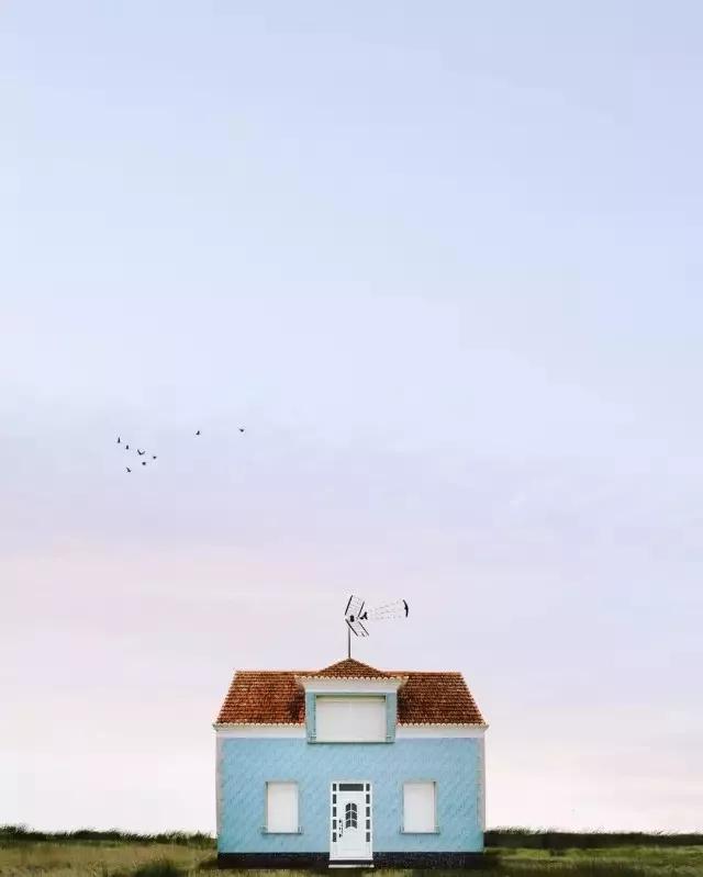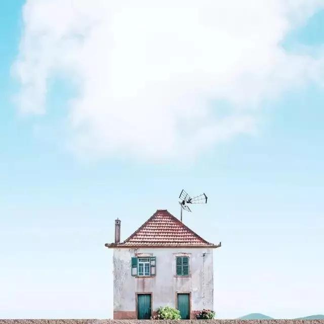 他的拍攝風(fēng)格統(tǒng)一,偏愛(ài)極簡(jiǎn)構(gòu)圖,多以藍(lán)天白云為背景,畫(huà)面的主角則是一座小房子。
