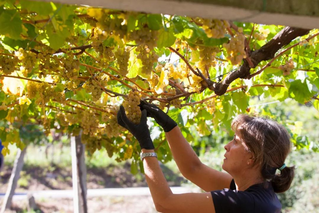 下海灣多數(shù)的阿爾巴尼諾(Albari?o)葡萄藤生長在花崗巖柱子上,高度比人還高,一串串的葡萄垂下來可以通風(fēng)來防止腐爛。