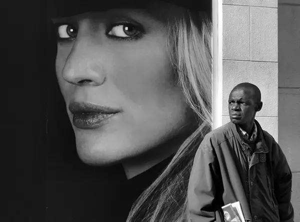 突出被攝主題的一個有效方法是讓它的尺寸看起來不太一樣,上面這張照片巨幅廣告里的女主角比實(shí)際生活中的男主角要大的多,對比起來,那個在角落里的黑人男性是那么卑微。