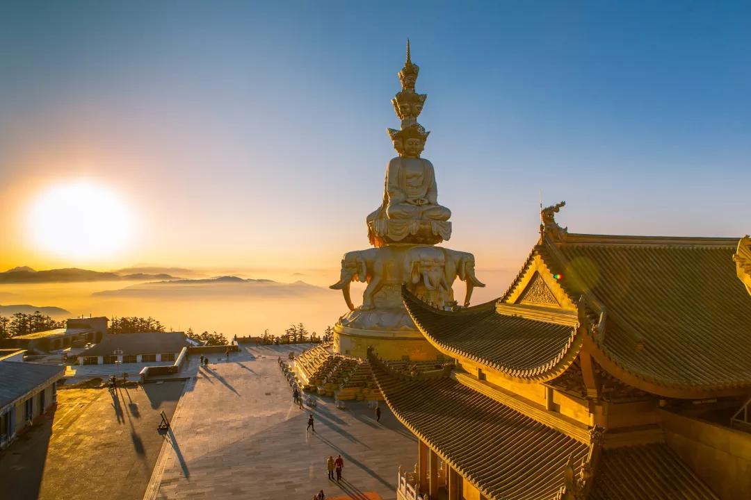 金頂擁有全世界最大的禮佛廣場(chǎng),在這里你可以朝拜48米高的【十方普賢】,與如織游人一起進(jìn)殿朝拜禮佛,披著金色日光與佛光交織而成的袈裟,體會(huì)全球最雄偉的佛教銅象的神圣和莊嚴(yán);或是順著那清幽的羊腸小道,感受“一山有四季,十里不同天”的自然景色;還可以在舍身崖俯瞰川西平原的優(yōu)美風(fēng)光,領(lǐng)閱一覽眾山小、風(fēng)光無(wú)限好的意境;