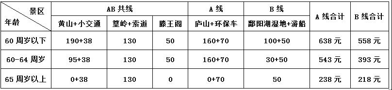 6、門票:根據(jù)各地景區(qū)、景點(diǎn)對不同年齡段老年游客的優(yōu)惠政策,我們把各景區(qū)不同年齡段的收費(fèi)標(biāo)準(zhǔn)列表如下,請各位老年朋友統(tǒng)一在專列上憑借本人身份證上的實(shí)際年齡把對應(yīng)的門票費(fèi)用交給全陪導(dǎo)游,年齡核對至出生年月日。旅游途中如因身體原因或其他特殊情況,沒有參觀的景點(diǎn)門票或景區(qū)小交通費(fèi)用在返程專列上由全陪退還。各位游客也可根據(jù)當(dāng)時當(dāng)?shù)氐捏w力情況自由選擇購票。(以下景點(diǎn)門票價格供參考,如遇景區(qū)政策性調(diào)價,則以景區(qū)實(shí)際門票政策為準(zhǔn),贈送項(xiàng)目不去無費(fèi)用退還):