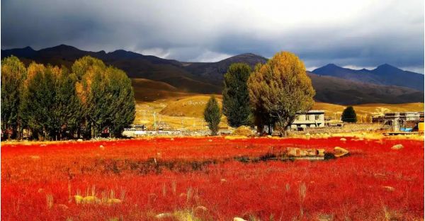 早上:8:30乘坐觀光車出亞丁景區(qū),后乘車至稻城后經(jīng)桑堆鎮(zhèn)觀【紅草地】(注:紅草地為季節(jié)性景觀,只有在每年的9月底到10月初才能看到此處的草原呈紅色),在秋天的時(shí)候,配合上后面泛黃的樺樹,倒映在水塘中,是許多書上所介紹的美景,之后翻越古冰川遺跡海子山到達(dá)丁真家鄉(xiāng)--理塘。