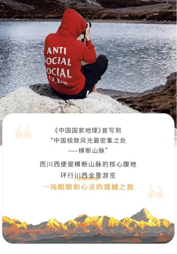 推薦理由:中國極致風(fēng)光最密集之處——橫斷山脈,而川西便是橫斷山脈的核心腹地,環(huán)形川西全景游覽,一場眼睛和心靈的震撼之旅