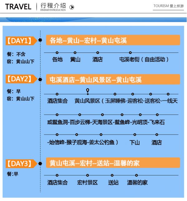 14:00——交通搭乘回程大交通返程。結束愉快旅行。溫馨提示:黃山北站參考14:30以后車次、黃山機場參考15點以后航班。周末大型節(jié)假日往后一小時。
