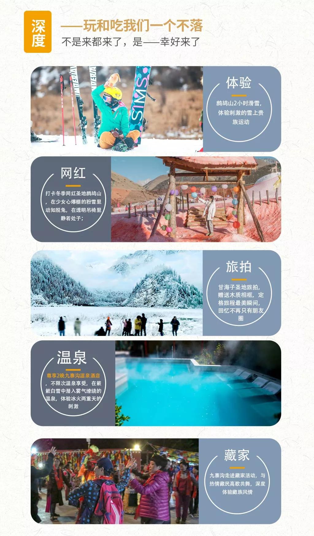 當(dāng)日行程:九寨溝得名于溝內(nèi)有九個藏族村寨,以“九寨六絕”——翠湖、疊瀑、彩林、雪峰、藏情、藍(lán)冰而聞名天下。遠(yuǎn)望雪峰林立,白雪皚皚;近看碧水澄澈,清可見底;除卻如夢似幻的自然景觀,還有藏家木樓、晾架經(jīng)幡、棧橋、磨房、藏族習(xí)俗及神話傳說構(gòu)成的人文景觀,也因這不二的美,你能在這里見到許多熱門影視劇里的取景場地。冬季的九寨溝變得尤為寧靜,也更具詩情畫意,山巒與樹林銀裝素裹,瀑布變成了一幅幅巨大的天然藝術(shù)冰雕如此潔白而高雅的世界,錯開擁擠的游人,卻能收獲一個觀賞九寨六絕之“藍(lán)冰”和“雪峰”的最好時機(jī)。