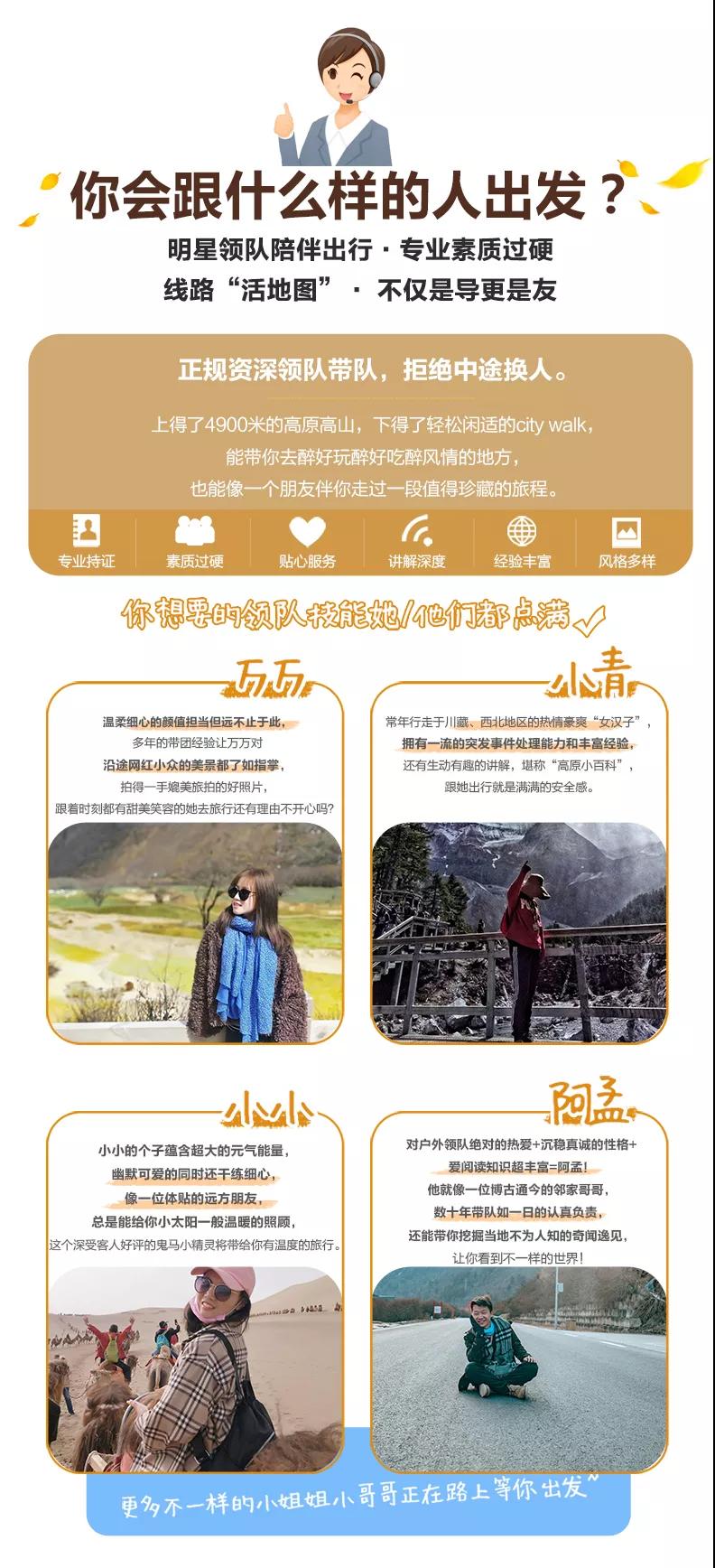 私人訂制:我們業(yè)務(wù)范圍囊括了全國(guó)各大城市,川西、西北、東北,在路上永遠(yuǎn)有我們的身影。我們將為每一個(gè)有定制需求的你策劃出獨(dú)屬于自己的完美旅行。