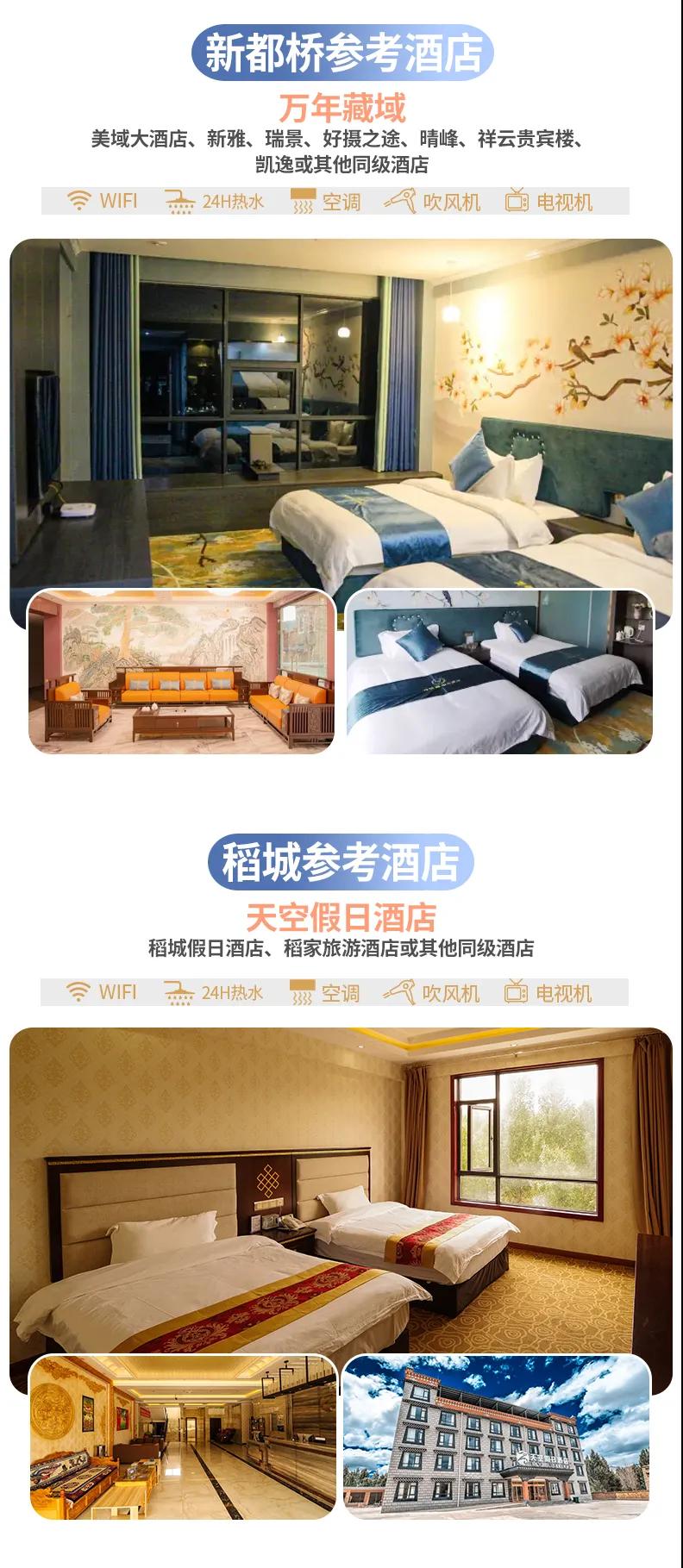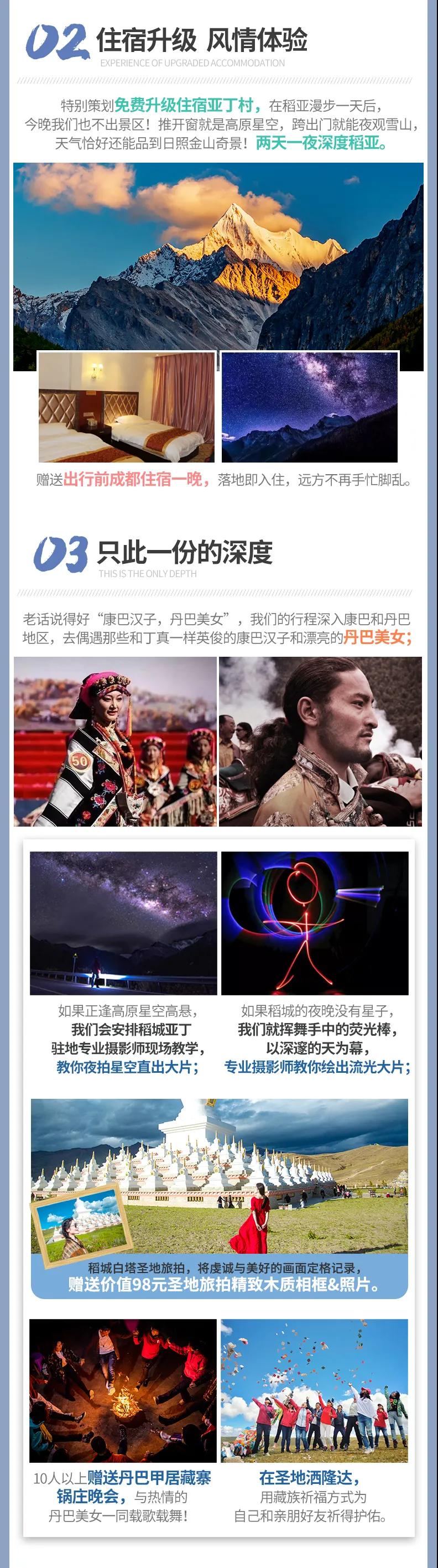 ? 贈(zèng)送:特色贈(zèng)送甲居藏寨藏家晚餐、高原特色牦牛湯鍋;贈(zèng)送旅游三寶、魔術(shù)頭巾、礦泉水緩解旅途疲勞;贈(zèng)送藏地撒隆達(dá);贈(zèng)送價(jià)值98元圣地旅拍精致木質(zhì)相框&照片;贈(zèng)送稻城專業(yè)攝影師現(xiàn)場(chǎng)教學(xué)夜拍星空直出大片,沒(méi)有星星時(shí)則教拍流光大片;10人以上贈(zèng)送甲居藏寨篝火晚會(huì);贈(zèng)送成都市區(qū)24小時(shí)接機(jī)/接火車服務(wù);贈(zèng)送項(xiàng)目不用不退。