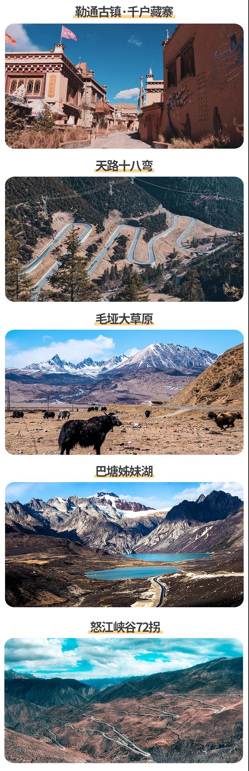 D4 雅江 — (約26公里/40分鐘)天路十八彎 — (約107公里/2小時(shí))理塘長(zhǎng)青春科爾寺、勒通古鎮(zhèn)·千戶藏寨— (約74公里/1.5小時(shí))毛埡大草原 — (約95公里/2小時(shí))巴塘 — (約223公里/5小時(shí))姊妹湖 — (約138公里/3小時(shí))芒康