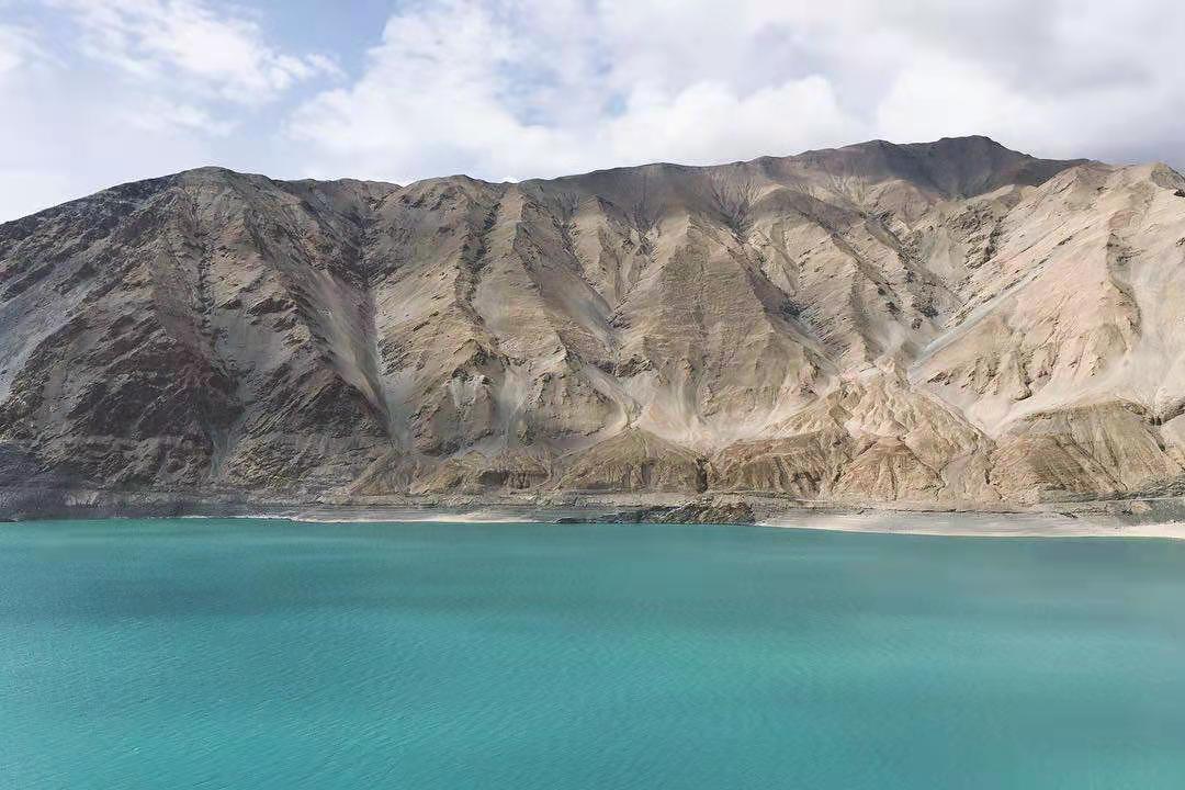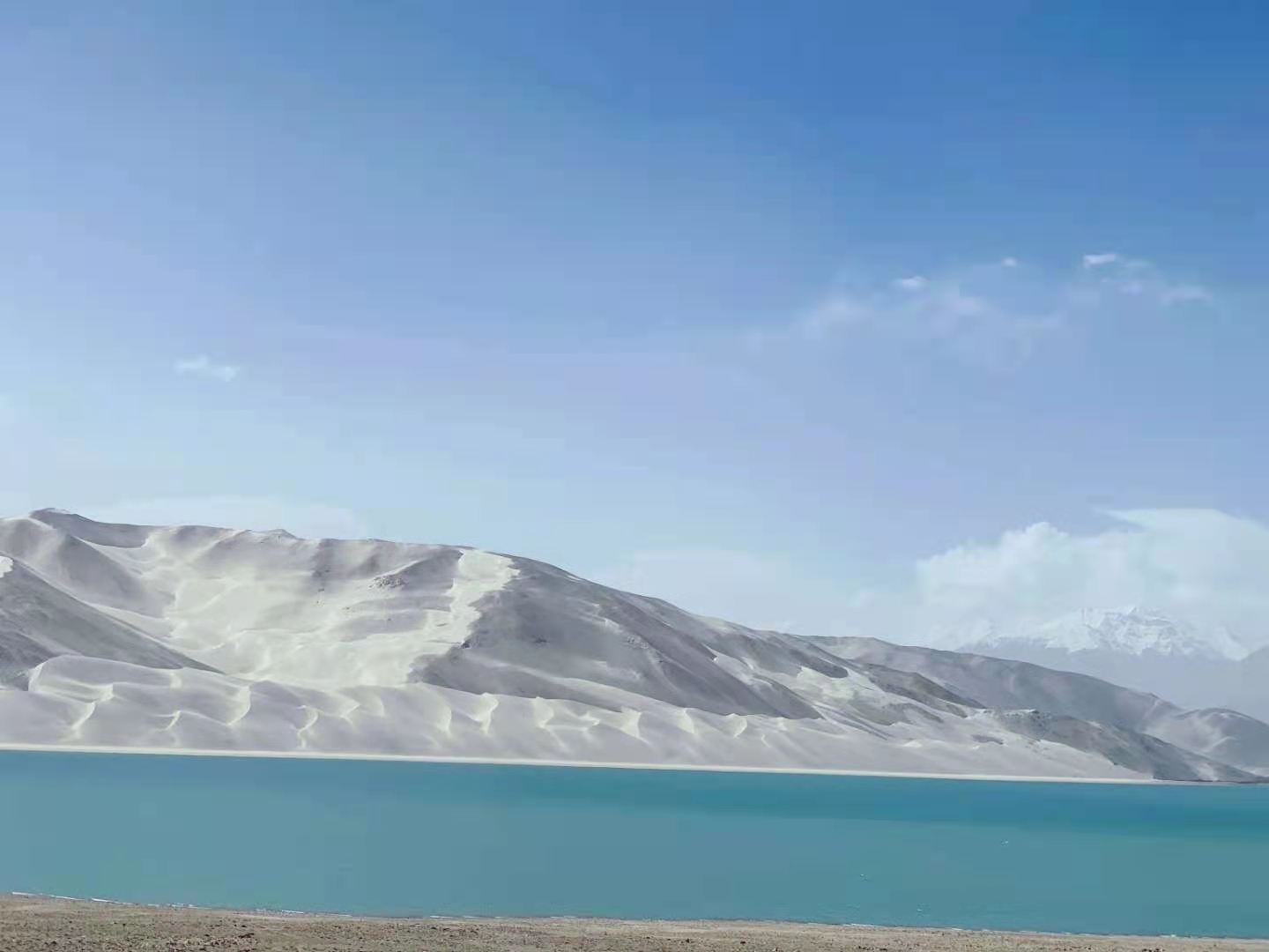 車子行進(jìn)在海拔三千多米的【蓋孜峽谷】中??龉废褚粭l玉帶,沿著蓋孜河在蓋孜峽谷中穿梭著,眼前的景色又變成了綿延不絕的荒山雪嶺。此時(shí)突然出現(xiàn)的美麗湖泊便是【布倫口白沙湖】湖水在帕米爾高原潔靜的陽光下,閃耀著金屬般的光澤。湖水在天空、白沙和雪山的綜合作用下呈現(xiàn)出一種別樣的藍(lán)。