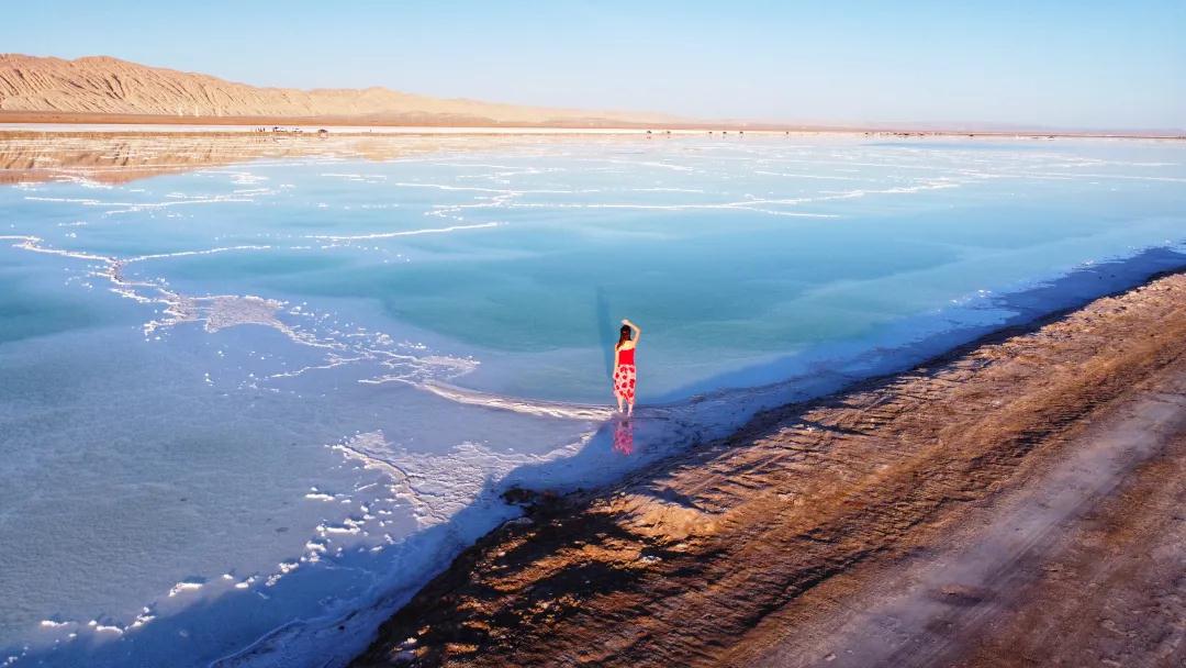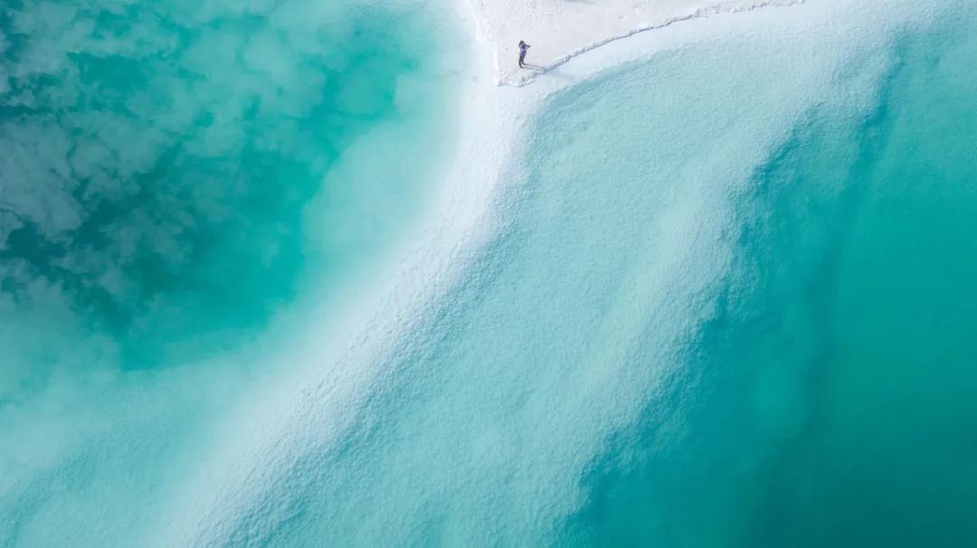 在水上雅丹不遠(yuǎn)處便是【東臺(tái)吉乃爾湖】。東臺(tái)吉乃爾湖被稱(chēng)為“中國(guó)的馬爾代夫”,湖水呈現(xiàn)純正的蒂芙尼藍(lán);乃爾湖岸邊盡是覆蓋著的白色結(jié)晶,湖周?chē)谴笃难诺さ孛玻钆渖项伾蓛舻綐O致的湖水、西北特有的廣闊無(wú)垠的天空,純粹而強(qiáng)烈的視覺(jué)沖擊,這方圓百里大漠戈壁無(wú)人區(qū)的珍寶明珠,這只屬于大自然的神秘顏色,讓你仿若來(lái)到了世界的盡頭,讓你感受一種歸于自然的內(nèi)心平靜。
