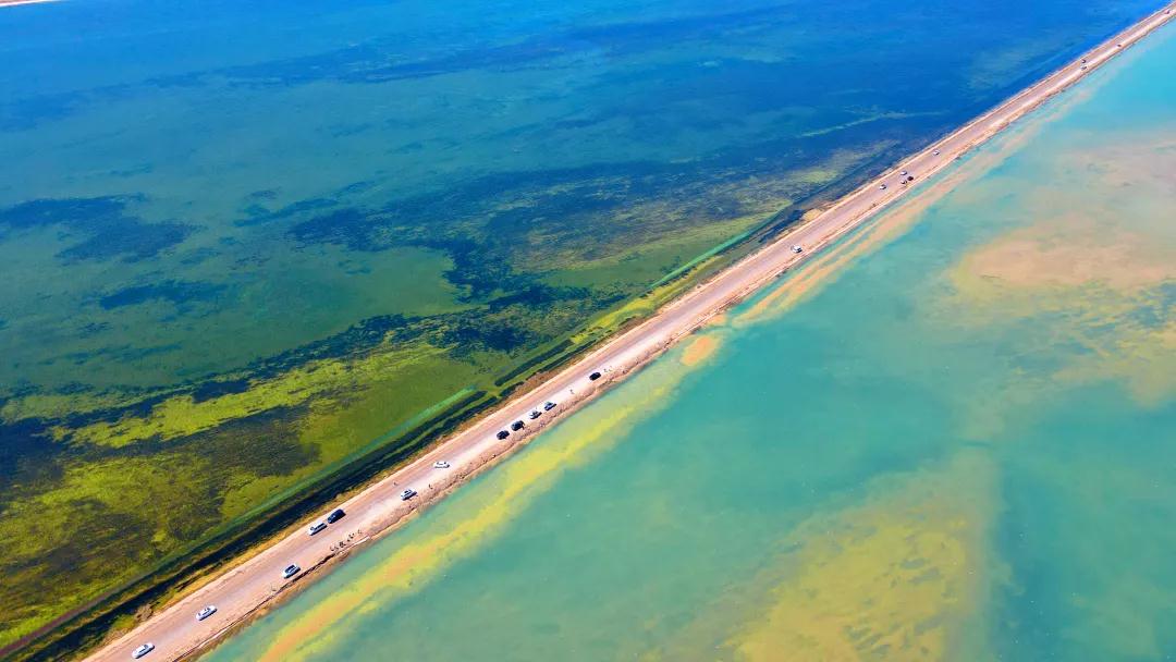 我們先抵達(dá)【西臺(tái)雙色湖】,西臺(tái)吉乃爾湖的神奇之處在于一條泥路將湖水一分為二,一半是蒂芙尼藍(lán),一半是純粹的綠;左邊碧綠如玉的是淡水湖,右邊瓦藍(lán)如天的是鹽水湖,雖然他是鹽湖,但是它那獨(dú)有的特色在中國(guó)也能領(lǐng)略到堪比馬爾代夫的亮點(diǎn),顛覆了你對(duì)任何湖的想象。最重要一點(diǎn)是這里還是一個(gè)未被開(kāi)發(fā)的超小眾地方,沒(méi)有摩肩擦踵,才有更好的風(fēng)景。