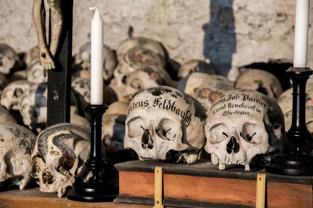 刻上姓名和生卒年月的頭骨被堆疊在一起