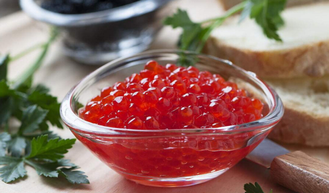 原料取自里海的鯨魚,嚴格說,只有用鯨魚卵制成的醬才能叫魚子醬。魚子醬是俄羅斯的頂級美食,其尊貴程度甚至要超越中餐里的鮑魚。魚子醬分為紅魚子醬和黑魚子醬兩種,黑色的產(chǎn)于鱘魚,紅色的產(chǎn)于鮭魚。