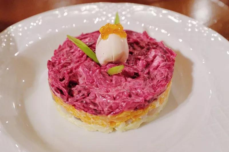 在海外傳播最廣的俄式料理非紅菜湯莫屬,即我們熟悉的羅宋湯。紅菜湯最早起源于烏克蘭,隨著俄羅斯文化傳入中國后,卻變成了另一個版本。大多數(shù)紅菜湯都不放甜菜,而是加大量番茄和土豆。真正的紅菜湯要保留甜菜鮮艷的紫紅色,湯底則用牛肉經(jīng)久熬成,需清澈入味,然后撒入新鮮蒔蘿,最后澆上一勺酸奶油才算完成。經(jīng)典款前菜是生腌鯡魚沙拉,一種是鯡魚切片搭配土豆,脂肪感滿滿,帶有濃郁的咸腥味和一點酸味。若想再狂野一些,不如來份牛舌沙拉,搭配小龍蝦是點睛之筆,兩樣看起來風馬牛不相及的東西,居然完美融合。另一種版本顏值更高,吃起來也輕松許多,鯡魚、甜菜、土豆、胡蘿卜等都切粒后,一層層疊起來,變成色彩斑斕的圓柱形,澆上色拉醬,味道立刻小清新了。主菜不用說,罐燜牛肉會是最保險的選擇,各種香料和肉塊一起慢慢煨燉,直到香濃爛酥,濃濃的醬汁配上土豆、胡蘿卜等蔬菜一起吃,絕對是一道非常符合東方胃的西式菜。