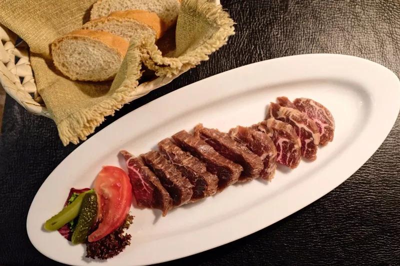換個角度看,相比被各種加工食品和農(nóng)藥蔬菜包圍的我們,西伯利亞土著們的飲食才是純正的有機天然,無需繁復的烹飪手段和調(diào)味方式,自然的即是最美味。在新西伯利亞市最熱門的Puppenhaus餐廳,一道擺盤極其簡陋的煙熏生腌牛肉令人回味無窮。牛肉厚切,脂肪與瘦肉的比例恰到好處,肉質(zhì)柔軟緊實,微微呈紅褐色的肉片發(fā)出迷人的光澤,煙熏的風味沒有濃烈到臘香的程度,而帶有果木的清香。