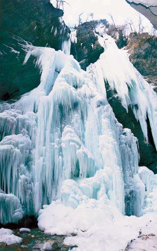 盤龍峽是官鵝溝第一道暗門。“暗門”這個詞是當(dāng)?shù)胤窖?,意思指“險峻的石峽”。盤龍峽給人的印象是由兩座石山排闥相對,面對面向前靠攏而形成的。長約一百多米,盤旋曲折,讓人感覺到好象在一條盤旋的長龍身邊走過。峽谷兩側(cè)皆是齊森森的石壁,青光光、濕漉漉的。峽壁崚嶒不齊,凹凸相間,人走到石棱凸出的地方,不小心會碰頭。河水撒著歡兒淌進(jìn)峽谷,順狹壁流出,東折西蕩,發(fā)出嘩嘩的聲響。整個峽谷最窄處僅兩、三米,最寬處也只有四、五米。抬頭仰視,兩側(cè)狹壁高插入云,將藍(lán)天劃成一條長長的飄帶。幽邃奇特的盤龍峽不知形成于哪個地質(zhì)年代,細(xì)細(xì)看去,一側(cè)峽壁凹進(jìn),則另一側(cè)峽壁凸出,兩邊石壁蜿蜒盤曲的走向相互吻合,該直都直,該曲都曲,盤旋前進(jìn),平行延伸。由此推斷,很久很久以前,這里是一座完整的石山,后來受地殼運動的影響,斷裂后形成一條奇特的峽谷。但看上去絲毫沒有“斧鑿”痕跡,令人驚嘆大自然造物的神奇。梯子崖是廟溝勝景之一。進(jìn)入廟溝,遠(yuǎn)遠(yuǎn)望去,首先映入眼簾的是一處崢嶸突兀的暗門,猶若一座天然的山門給人們敞開,石山之上冷杉佇立,蒼翠挺拔,仿佛守衛(wèi)山門的士兵。進(jìn)入山門,山勢悄然開闊,沿路而行,山勢又陡然變窄,形成鎖控咽喉之勢,兩山崚嶒直上云天,中間橫亙著一個巨大的“將臺”,寬闊碩大,堵塞了入溝之路。這個將臺分左中右三部分。版權(quán)所有山東聊城聊之旅國際旅行社有限公司,轉(zhuǎn)載必究!中部光滑濕潤,一股湍流自將臺頂部沖激而下,自右側(cè)縱貫而出,呈三級落差,擊落于水潭之中,揚起層層水浪,飛花四濺,轟然巨響,聲勢震天,隆隆不絕……定晴細(xì)看,將臺左側(cè)緊貼左邊山巒,似乎無處可攀,卻又緊挨著山巒處橫著一道一道的石痕,宛如一副細(xì)巧的石梯纏繞在將臺上,僅容一人小心翼翼方可攀援而上,通過將臺。這樣的將臺在此峽接連有十幾個,階階而上,可謂天工巧設(shè),布局精妙,當(dāng)?shù)厝朔Q之為梯子崖。