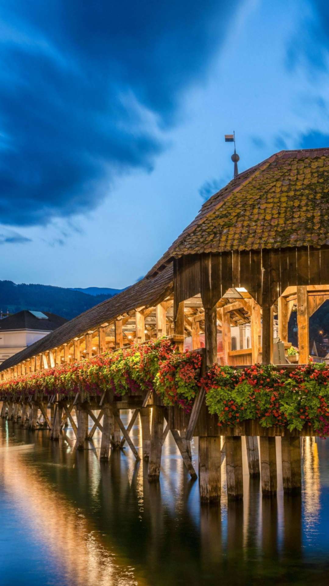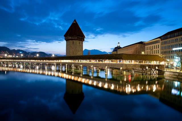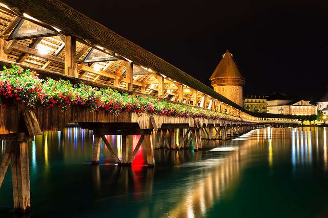 瑞士琉森最負(fù)盛名便是卡佩爾廊橋Chapel Bridge(Kapellbrücke)又叫教堂橋,這是盧塞恩的標(biāo)志,始建于1333年,也是歐洲最古老的有頂木橋,橋的橫眉上繪有120幅宗教歷史油畫(huà),沿途還可欣賞描述當(dāng)年黑死病流行景象的畫(huà)作。