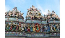 維拉瑪卡里雅曼興都廟(Sri Veeramakliaman Temple)建于1855年。特殊的彩繪門樓屬典型的南印度建筑風(fēng)格,門上高聳的塔樓上裝飾許多立體的彩色神像,廟里則是供奉主掌生死的"卡莉女神"(Kali)。雕刻在門樓上的印度教諸神與圣物牛、斗士等,在太陽的照耀下閃閃發(fā)光,耀人眼目。寺廟周圍的墻壁,都被涂成紅白色,極富喜慶氣氛。