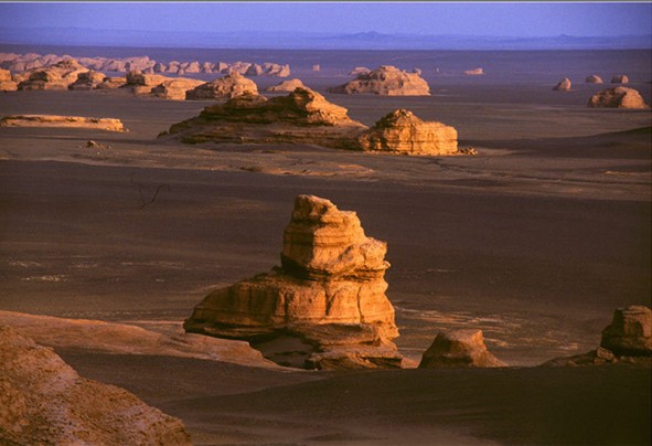 白天,遠(yuǎn)遠(yuǎn)望去,沙漠幻景猶如煙波浩渺的大海,整個(gè)"雅丹魔鬼城"恍若飄浮其中。傍晚蜃景隱去,整個(gè)"雅丹魔鬼城"籠罩在夕陽余輝下,金碧輝煌中更顯幾分神秘,幾分肅穆。夜幕降臨后,狂風(fēng)呼嘯,整個(gè)"魔鬼城"又陷入恐怖的氣氛中,令人毛骨悚然。