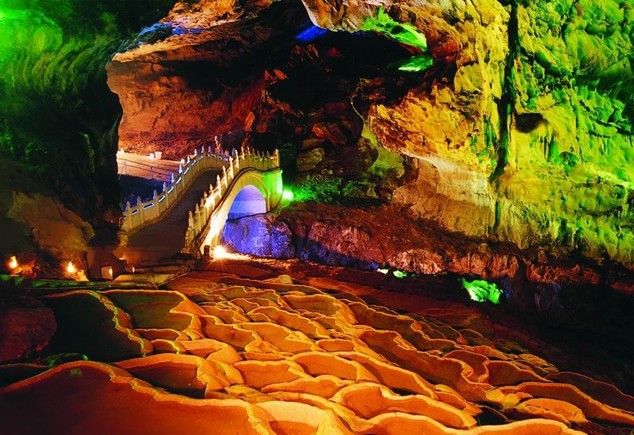 洞內(nèi)有無數(shù)千姿百態(tài),瑰麗多彩的鐘乳石,游覽范圍共分三層:上中兩層為陸地層,廳堂高大寬闊,巖壁堅(jiān)固,雄偉壯觀,“瀑布”“山林”“谷”“田園”“瑤寨”百花爭艷,鳥飛云走……;下層是一條地下暗河,由北向南蜿蜒1500米,經(jīng)過三個美麗的峽谷,穿過四座山頭底部,河面寬1.6米,水深1-7米,兩岸奇景密布,巧奪天工,美不勝收。有洞中之寶”金雞報喜”飛象過河”還有地下河最高最大,版權(quán)所有山東聊城聊之旅國際旅行社有限公司,轉(zhuǎn)載必究!一物兩景的“壽星公”“飛瀑奇石”“花鳥神閣”……。各處自然美景無不讓人吧為觀止。樂而忘返!