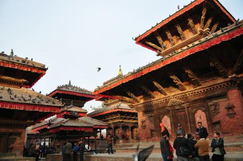 布帕亭德拉·馬拉國王之母拉克絲米于1690年所建的太后廟構(gòu)造奇特。它是建于九層臺基之上的三層瓦檐的濕婆神廟,但廟頂卻是一座尖頂佛塔,在尼泊爾寺廟中為絕無僅有。其它如著名的斯瓦揚布佛塔、塔萊珠女神廟、帕蘇帕蒂納,以及建于五層臺基上的三界魔力寺、有五扇雕花木門的濕婆帕爾瓦蒂廟、三重檐的文藝女神廟、八角形的黑天神廟等,有的布局嚴(yán)謹(jǐn),造型典雅,有的畫棟雕梁,金碧輝煌,有的以廟內(nèi)精美的木刻神像著稱,有的以廟前的鎦金銅獅馳名,造型各異,各有特色。版權(quán)所有山東聊城聊之旅國際旅行社有限公司,轉(zhuǎn)載必究!有一尊用完整的、高約5米的黑石鑿成的黑色拜拉布神像,立于路旁,此神為濕婆的化身。雕像足踏怪魔,頭戴骷髏飾帽盔,頸掛垂至腹下的一串人頭骷髏,6手各握武器,赤眉如火,巨眼圓瞪,令人恐懼。此像已有300余年,過去,民間犯罪、興訟或爭執(zhí),要先到這里,以手觸石,誓不誑言,然后審問斷案。1980年聯(lián)合國教科文組織將它列為亞洲重點保護(hù)的18座古城之列。