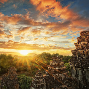 巴肯寺正對(duì)羅洛寺建筑群,它建造在吳哥古都附近的一座孤立的山上。位于吳哥城外南面,原為都城的中心,臺(tái)基為金字塔式的五層,各層有塔,層層而上,極為壯觀。在山頂可以俯瞰吳哥窟全景、吳哥古都和周?chē)木包c(diǎn),是看日出和日落的最佳地點(diǎn)。