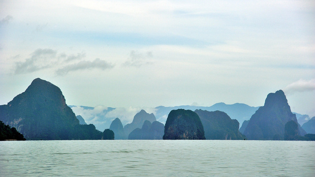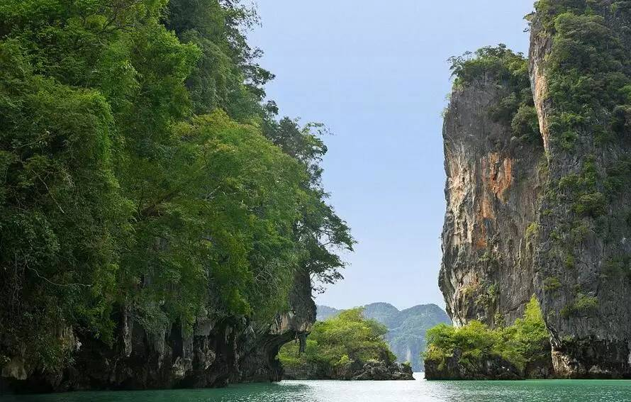 攀牙灣山峰聳峙,海景如畫,風(fēng)光雄渾壯麗,酷似桂林的山水:屏干島,由兩面山峰傾斜地相疊一起,呈倒V