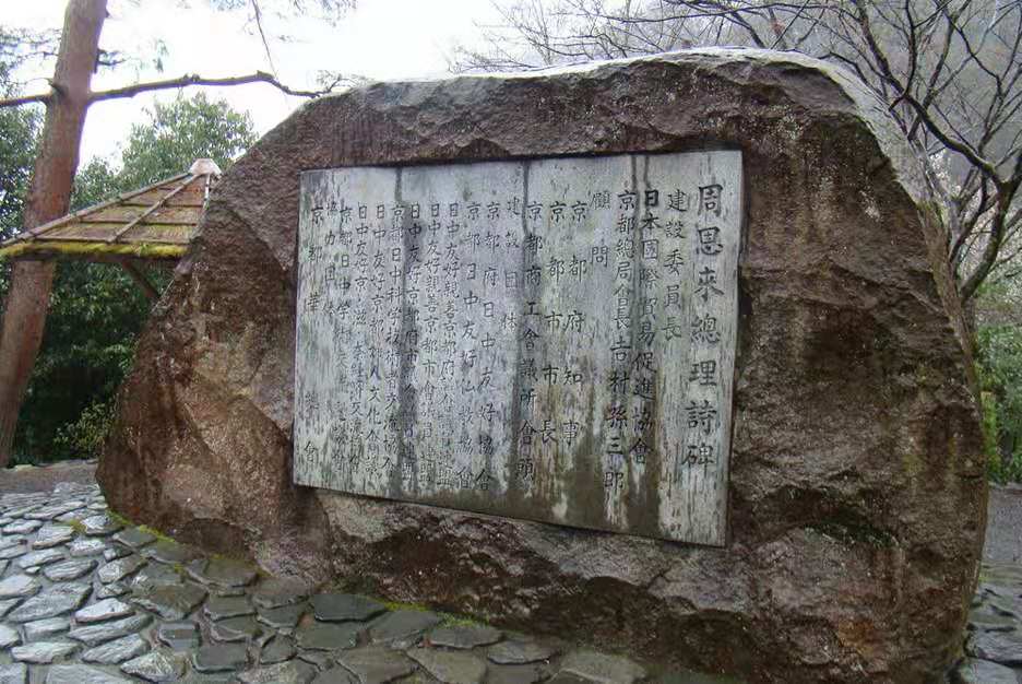 1917年9月,周恩來東渡日本留學(xué)。1919年4月在回國途中,他游覽了京都,并撰寫白話詩四首。1979年1月22日,由京都各日中友好團體和知名人士聯(lián)合倡議,成立了“周恩來詩碑籌建委員會”。1979年4月16日,詩碑建成。
