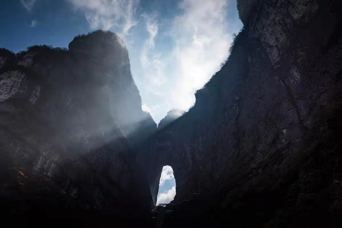 界天門(mén)山國(guó)家森林公園的天門(mén)山主峰,有一個(gè)巨大的山洞,這就是舉世聞名的天門(mén)洞。