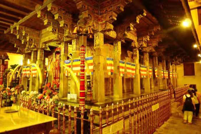每層小金塔內(nèi)藏著各國佛教徒供奉的珍寶,最后一個小金塔不到1米高,塔頂飾有一枚鉆石,塔里有一朵金蓮花,花芯有一玉環(huán),長約5厘米的佛牙就安放在這玉環(huán)的中間。每日早、中、晚3次在震懾人心的鼓樂聲中,由3位高僧,分持3把不同的門匙開啟內(nèi)殿大門,進(jìn)入內(nèi)殿,版權(quán)所有山東聊城聊之旅國際旅行社有限公司,轉(zhuǎn)載必究!舉行隆重的敬拜儀式,儀式之后再開啟內(nèi)殿拱門,讓信徒與游人從門外魚貫瞻仰供奉佛牙的佛牙塔。佛牙寺四周有高墻圍繞,圍墻四角各建有一廟,即納特(觀音)廟、摩訶廟、卡多羅伽摩廟和帕蒂尼女神廟,據(jù)說這4座廟是為了保護(hù)佛牙建立的。