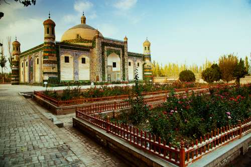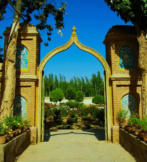 阿帕霍加墓與香妃墓坐落在喀什市東郊5公里處的浩罕村,是一座典型的伊斯蘭教式的古建筑群。陵墓始建于1640年前后。據(jù)說墓內(nèi)葬有同一家族的五代72人。因其中葬有明末清初喀什著名伊斯蘭教“依禪派”大師阿帕霍加而得名。阿帕霍加是墓中第二代人,曾一度奪得葉爾羌王朝的世襲政權(quán),更成為17世紀“依禪派”伊斯蘭教的首領(lǐng),名望遠遠超過其傳教大師的父親。