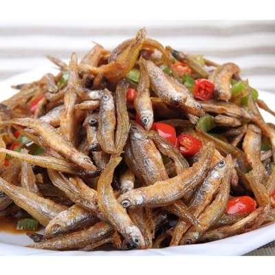 熱鍋放油,放入姜片,紅辣椒炒兩下,加進(jìn)小干魚,辣椒好了起鍋,一盤香噴噴的炒小魚干就好了